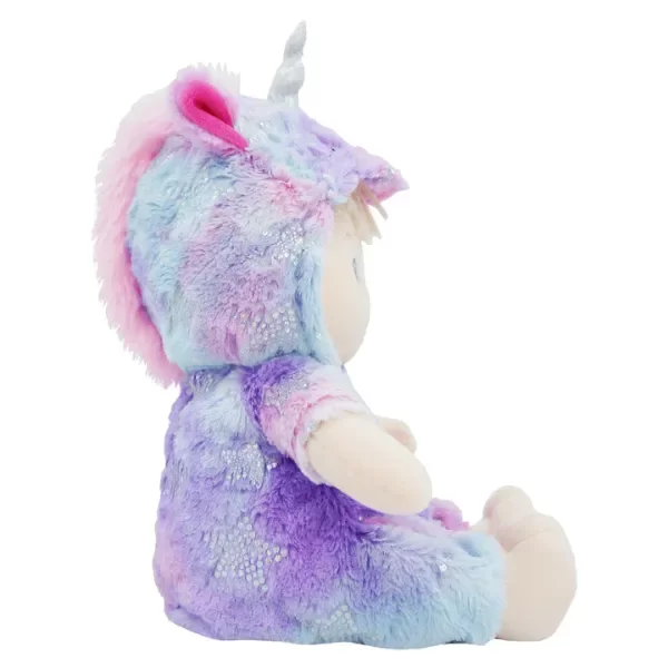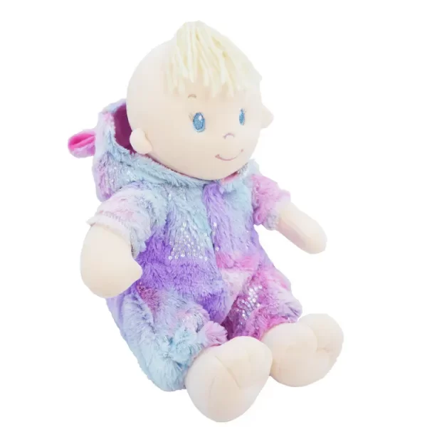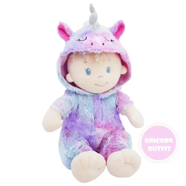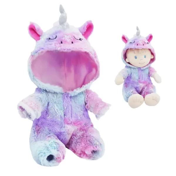 Esta muñeca es diseñada para niños desde su nacimiento, presenta un traje de unicornio morado degradado de felpa con detalles bordados y un distintivo cuerno plateado brillante, que conquista los corazones de los amantes de los unicornios. Su cierre de velcro facilita el cambio de ropa, fomentando la motricidad fina y el juego imaginativo de los niños.
