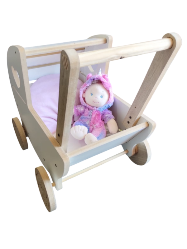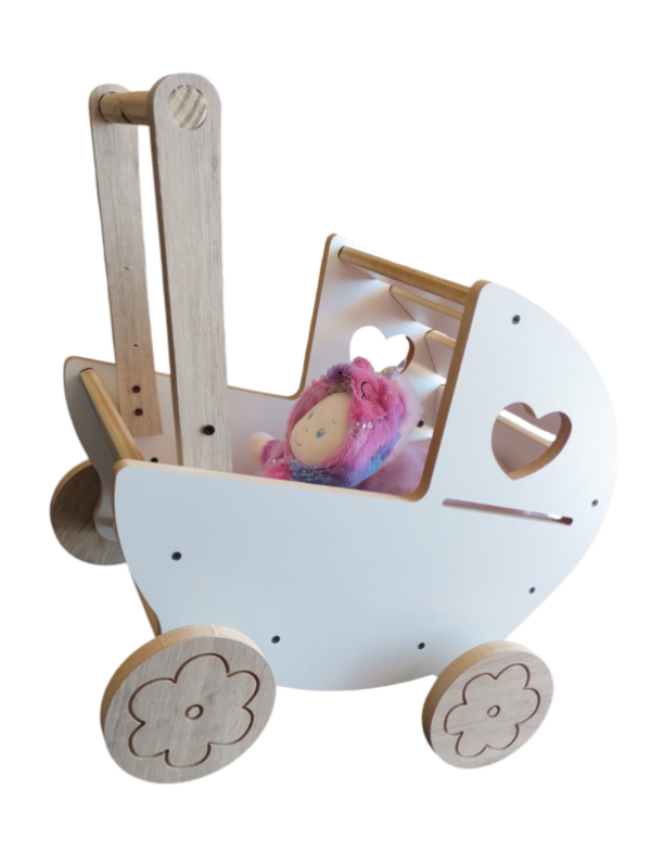 Este precioso cochecito de madera combina un diseño moderno y elegante con la calidez de los materiales naturales. Su robusta estructura en tonos blancos y madera, con detalles encantadores como las ruedas en forma de flor y el corazón troquelado, lo hacen ideal para cualquier rincón de juegos.