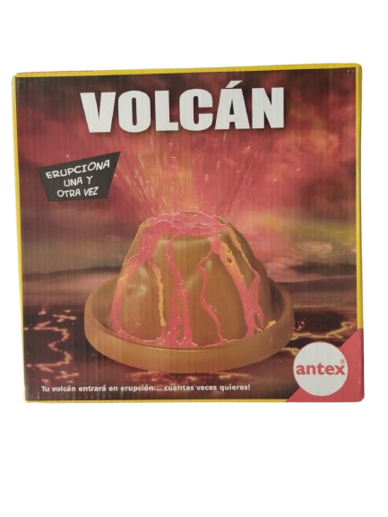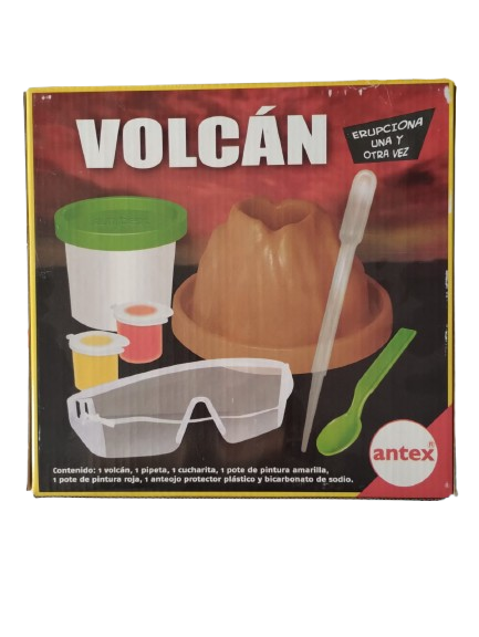 * Contenido: 1 volcán, 1 pipeta, 1 cucharita, 1 pote de pintura amarilla, 1 pote de pintura roja, 1 anteojo protector plástico y bicarbonato de sodio.