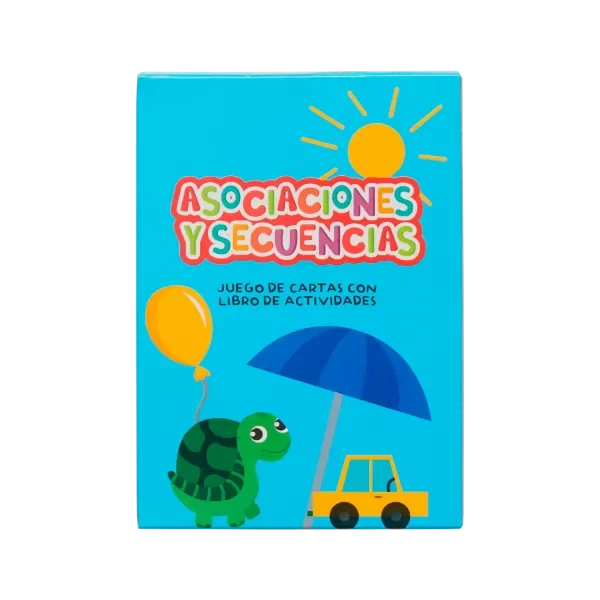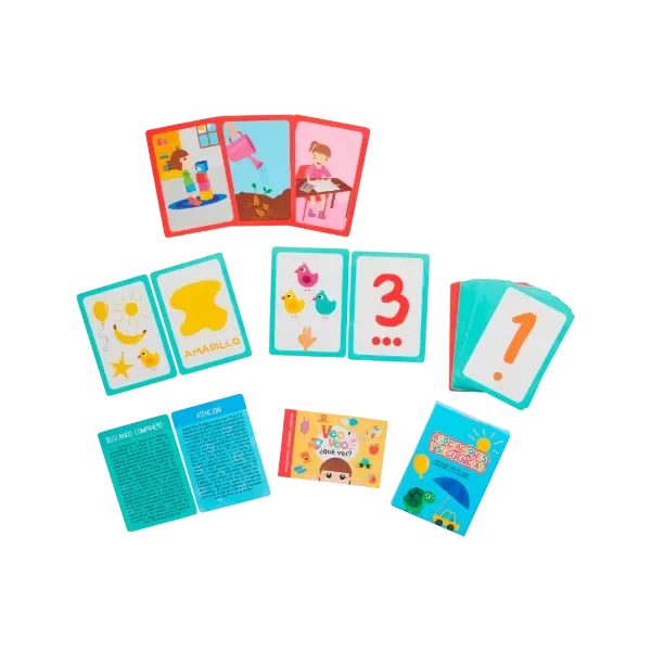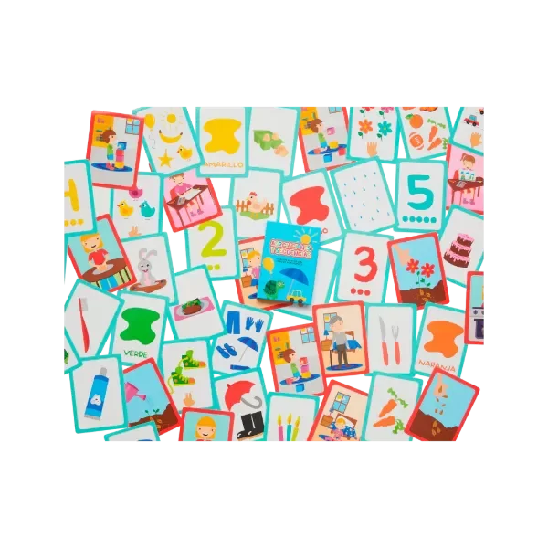 • 49 cartas educativas para trabajar asociaciones y secuencias donde se trabaja números, colores, objetos y escenarios comunes para los niños y niñas.