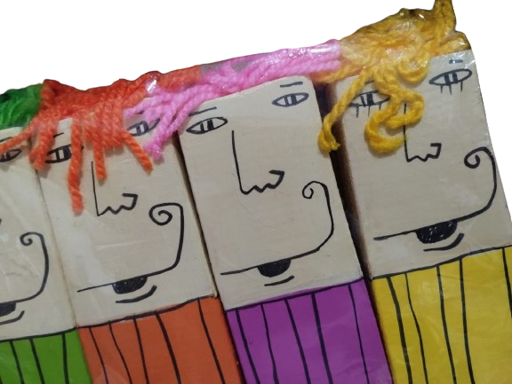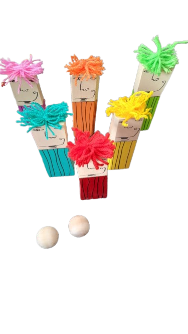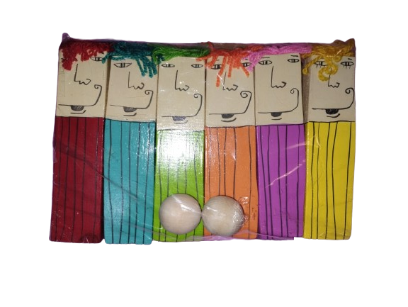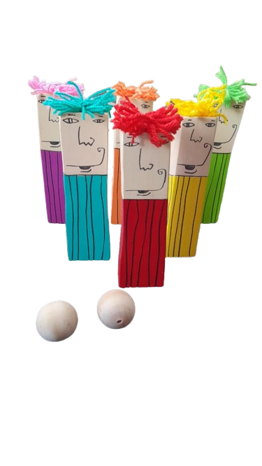 Cada set incluye pequeñas personitas de madera en lugar de los clásicos pinos, pintadas a mano en dos colores distintos, con dos bolitas de madera para completar el juego.