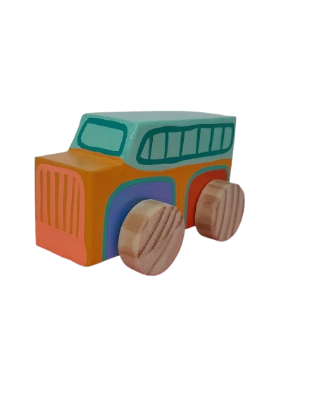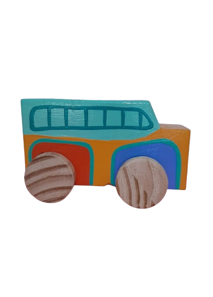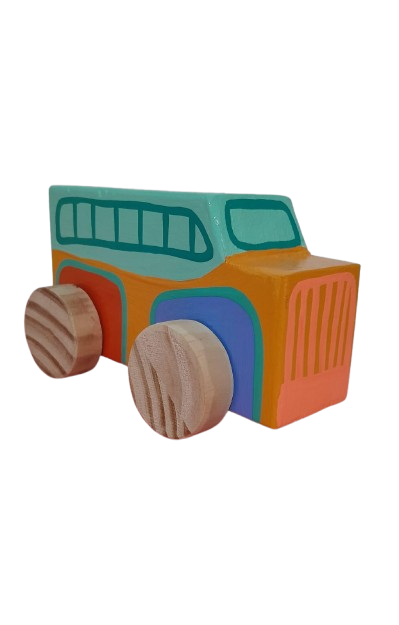 Colectivo de madera pintado a mano con colores llamativos, ideal para pequeños exploradores.