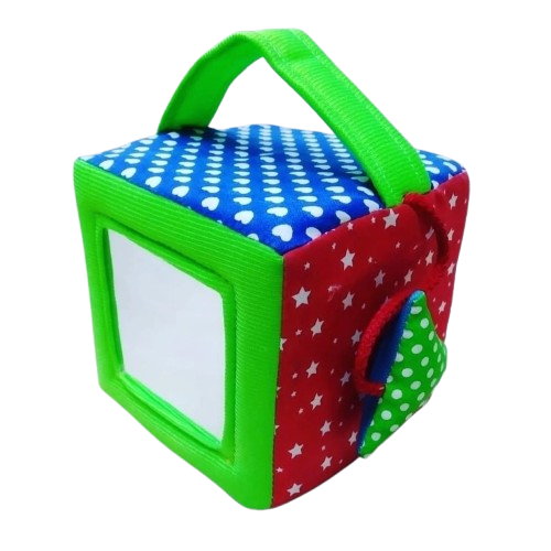 El CUBO DE ACTIVIDADES es de goma espuma recubierta en tela con espejo irrompible y formas aferradas con cordón a su lado correcto.