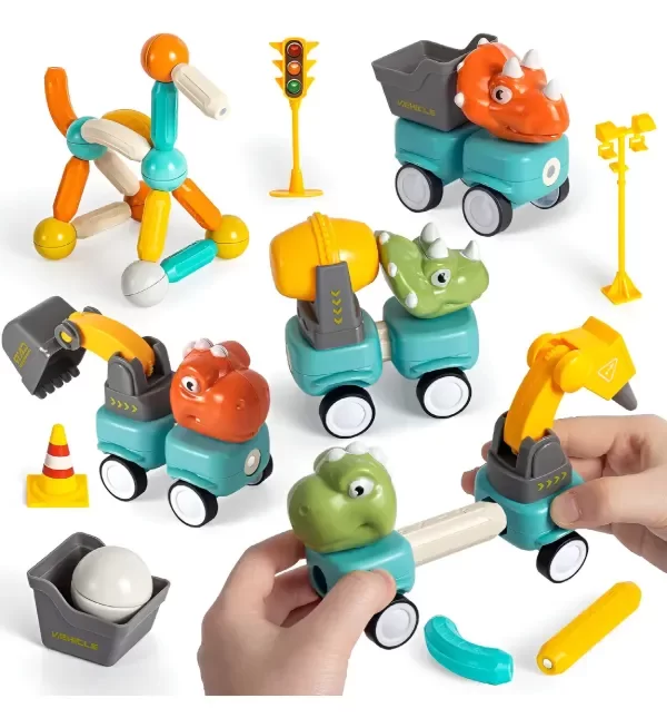 Crea emocionantes aventuras con estos adorables dinosaurios constructores. Conecta las piezas magnéticas fácilmente para armar vehículos únicos, figuras divertidas ¡y todo lo que tu imaginación dicte!