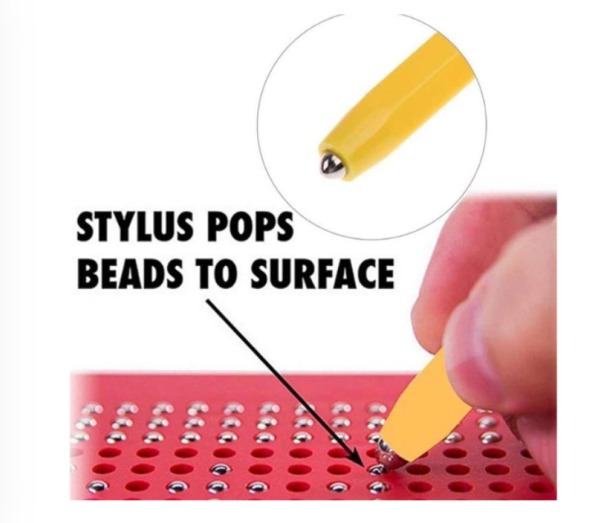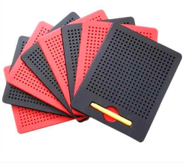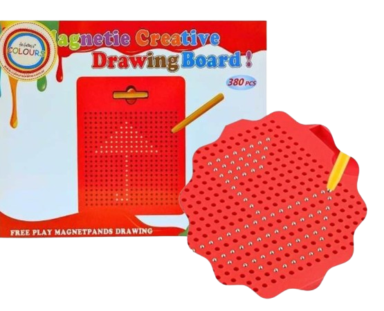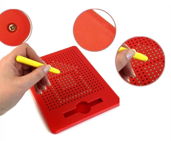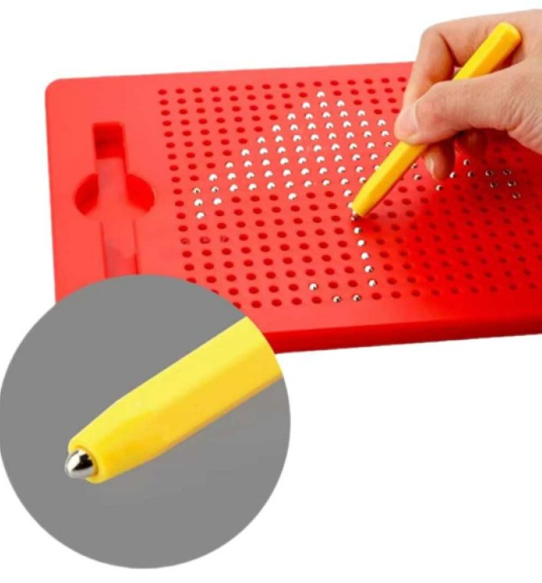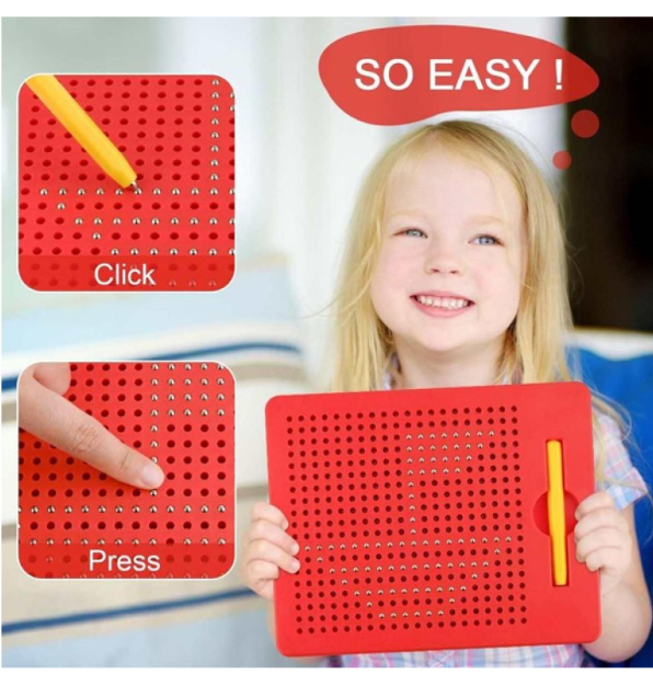 Esta pizarra magnética para dibujar es una herramienta de dibujo interesante en la que los niños pueden crear sus propios diseños únicos tirando de las cuentas hacia la superficie con un clic audible con el bolígrafo magnético. Cada cuenta está en su propio bolsillo y no se cae. Para borrar la pizarra, simplemente pase la mano o el bolígrafo por las bolas magnéticas. Maravilloso juguete de aprendizaje para practicar letras, formas, números y diseños simples, o simplemente para hacer garabatos. Tamaño portátil, conveniente para llevar de viaje.
