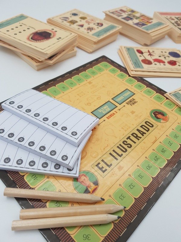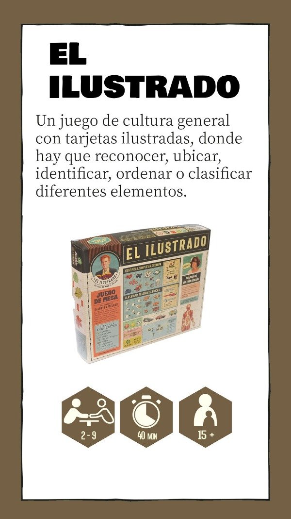 El Ilustrado es un juego de mesa de cultura general con tarjetas ilustradas donde hay que reconocer, ubicar, identificar, ordenar o clasificar diferentes elementos para demostrar todo lo que sabés. El juego cubre diversos temas y no es solo para sabelotodos del conocimiento académico: tipos de baile, yerbas, discos de los Stones, canchas de deportes, marcas, países y hasta herramientas aparecen en estas muchas tarjetas ilustradas por el talentoso Andrés Miguens.