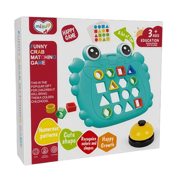 ¡Es una carrera! Elige una tarjeta de patrón y sé el primero en encastrar las figuras de colores en tu cangrejo. ¡El más rápido en tocar la campana gana la ronda!