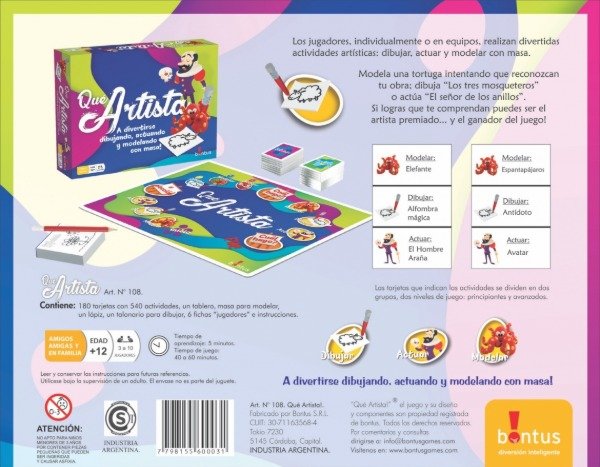 180 tarjetas con 540 actividades, un tablero, 1 pote de masa para modelar, 1 lápiz, un talonario para dibujar, 6 fichas "jugadores" e instrucciones