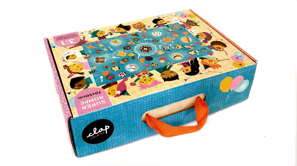 35 piezas de10x10cm (variable) + 7 piezas redondas de 6,5cm de diámetro. Caja de cartón micro corrugado + manija: 30cm x 21cm.