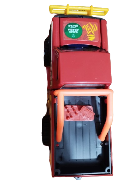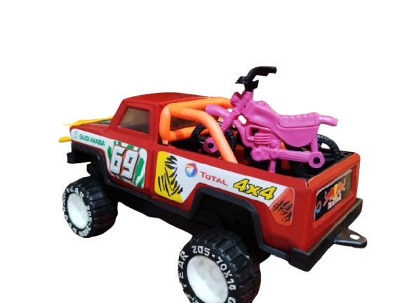 Siente la emoción del rally con esta impresionante camioneta de metal , diseñada para los amantes de la velocidad y los desafíos. Sus detalles auténticos , como la numeración "69", los logos de "Saudi Arabia" y "Total", y especialmente esa moto de cross removible en la parte trasera , la hacen única. Con ruedas robustas y resistentes , está lista para conquistar cualquier terreno imaginario.
