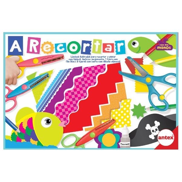 Incluye: pegamento, 1 tijera con filo liso y 3 tijeras con corte con diseno especial.