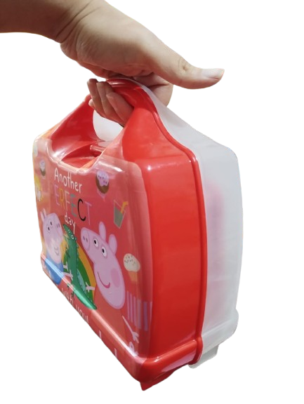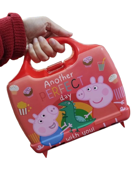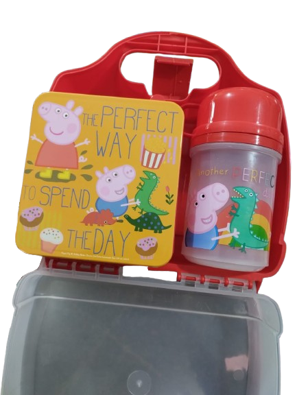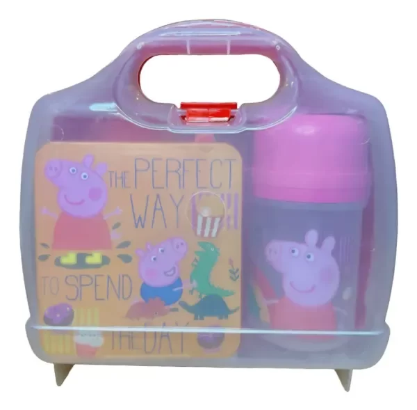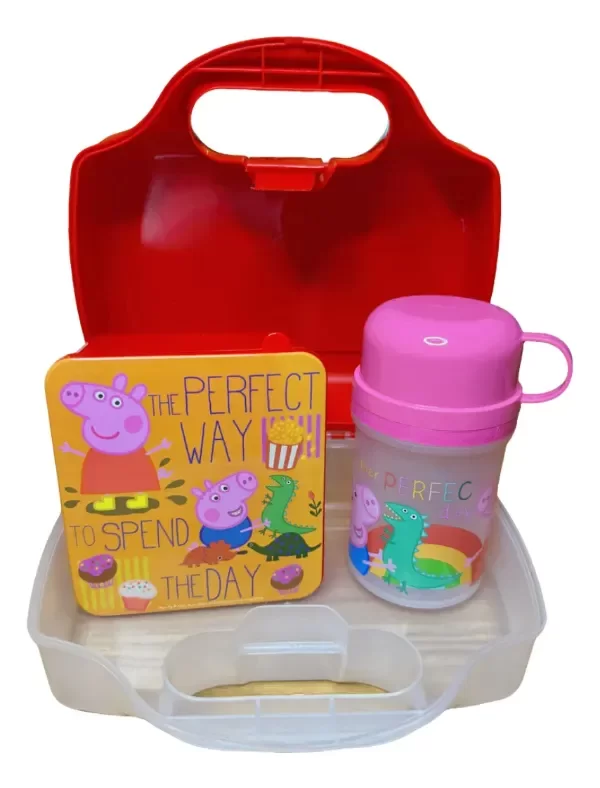 Este encantador set de lonchera de Peppa Pig es el compañero ideal para que los más pequeños disfruten de sus comidas en el jardín, la escuela o en cualquier paseo. Incluye una práctica cantimplora para mantenerse hidratados y un tupper perfecto para guardar su sándwich o sus snacks favoritos.