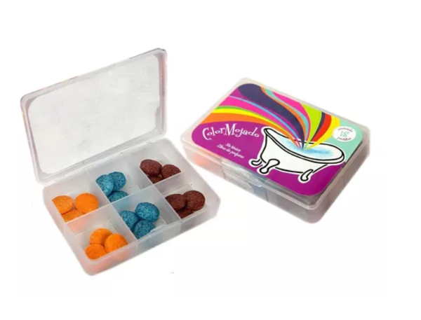 Color Mojado: pastillas, con un toque de efervescencia, que dan color al agua de la bañadera, vienen en los tres colores primarios (rojo, azul y amarillo),