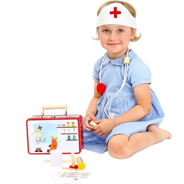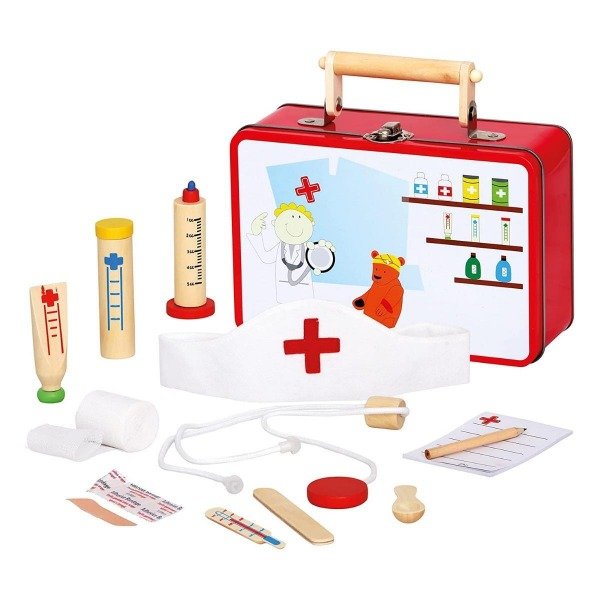 El set contiene: vincha de doctor/a, estetoscopio, libreta de diagnóstico, termómetro, inyección, pomada, cuchara, bajalengua, pastillas, vendas y gasa.