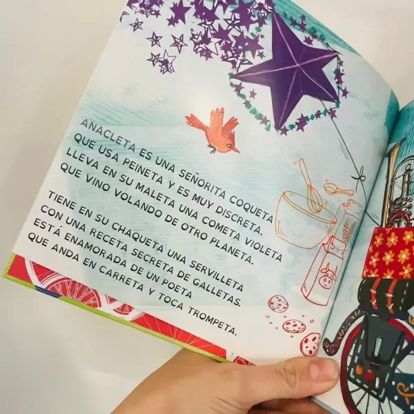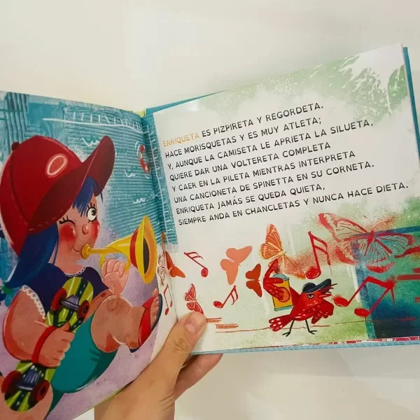 Anacleta anda en bicicleta/ El Señor Martínez anda en patines/ Doña Leda anda en una rueda/ El viejo Periclo anda en triciclo/ Enriqueta anda en patineta.
