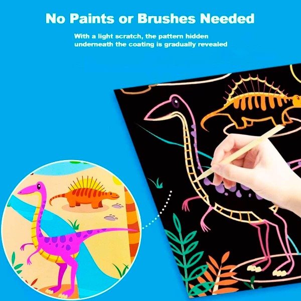 ¡Raspa la superficie y dale vida a tus obras de arte más brillantes! Un regalo perfecto para pequeños artistas y grandes imaginadores.